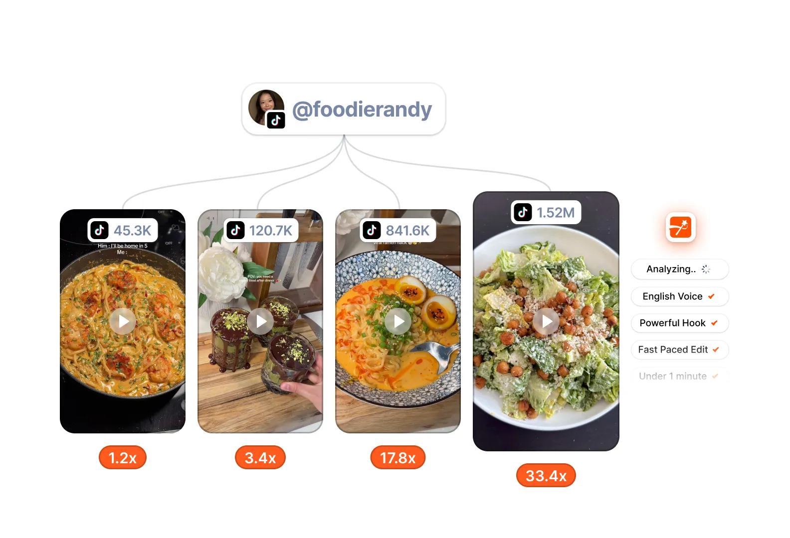 Our AI analyses thousands of short-form videos daily and ranks them based on real engagement metrics in your niche.